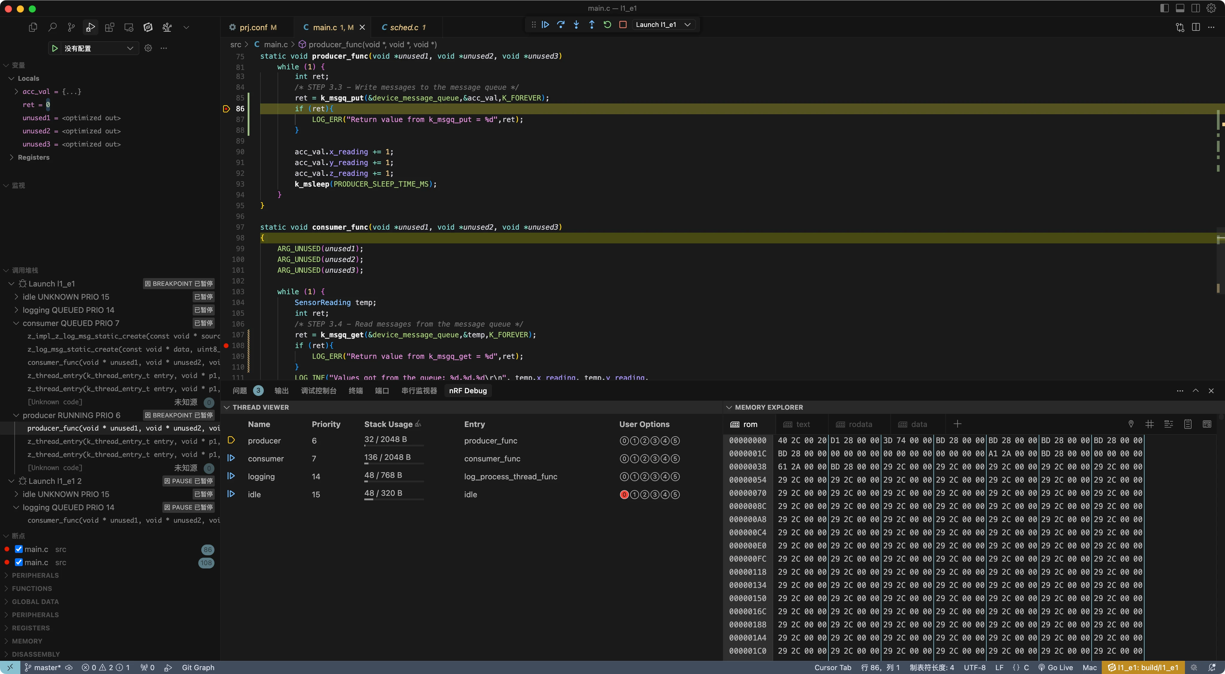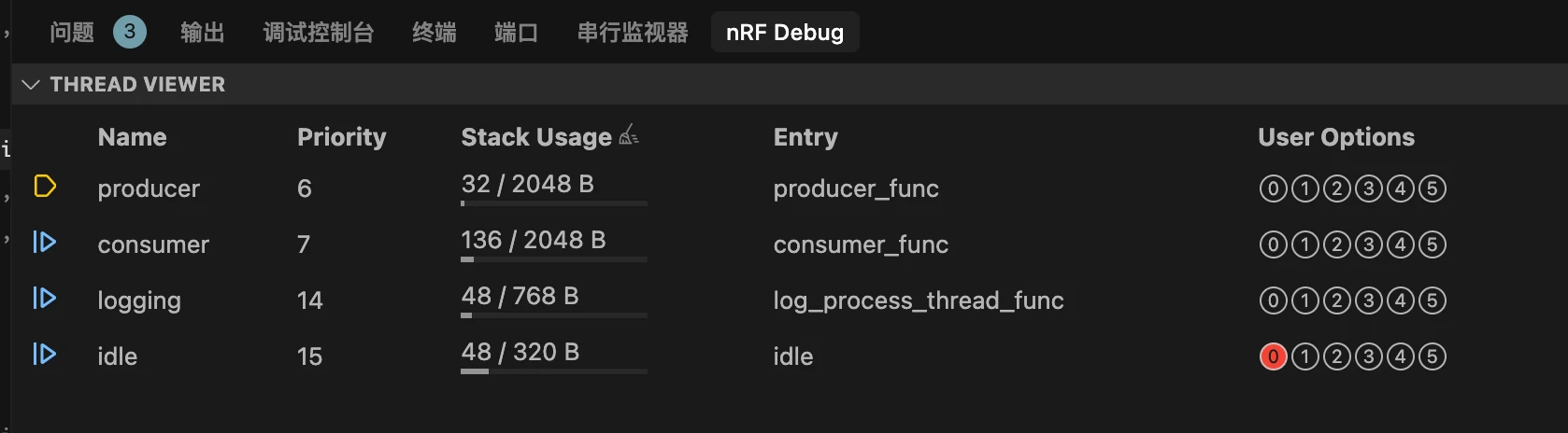 k_thread。可以把它理解为每个线程的“身份证”或“档案”。RTOS 内部会为每一个线程维护一个这样的实例,用来记录和追踪该线程的所有信息,也就是它的元数据 (metadata)。栈 (Stack):每个线程都拥有自己独立的栈空间。栈用于存放函数调用时的局部变量、返回地址等信息。栈的大小必须根据该线程所执行任务的复杂程度来合理设置,设置过小会导致栈溢出,引发程序崩溃。