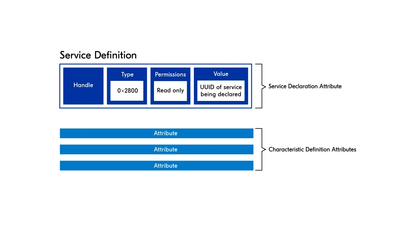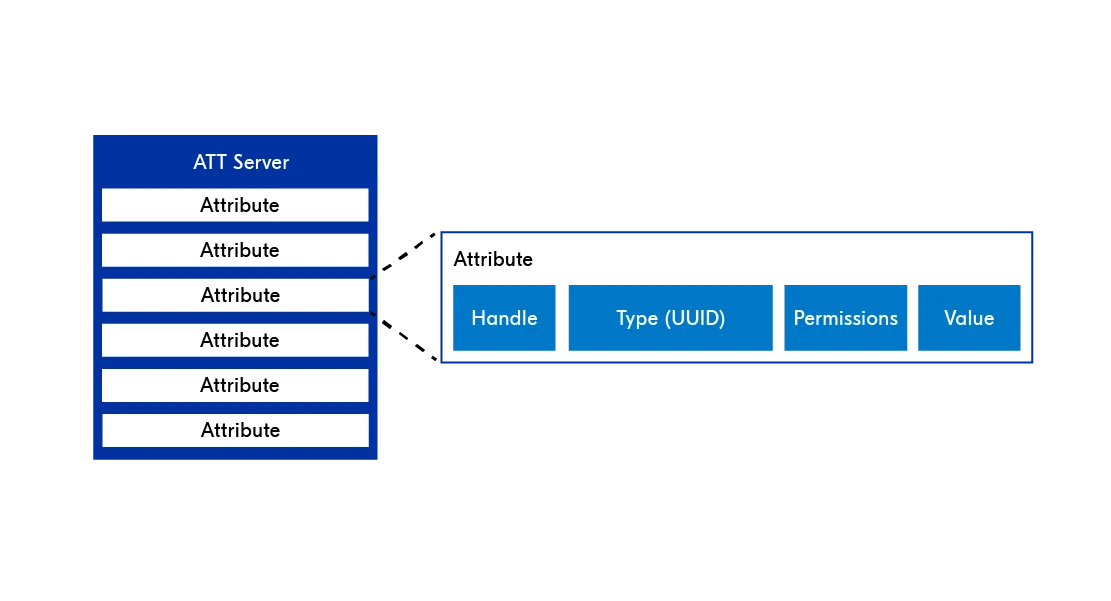 ATT 协议定义了一种标准化数据结构,称为属性(Attribute),用于在服务器端存储数据。服务器可以同时持有多个属性。