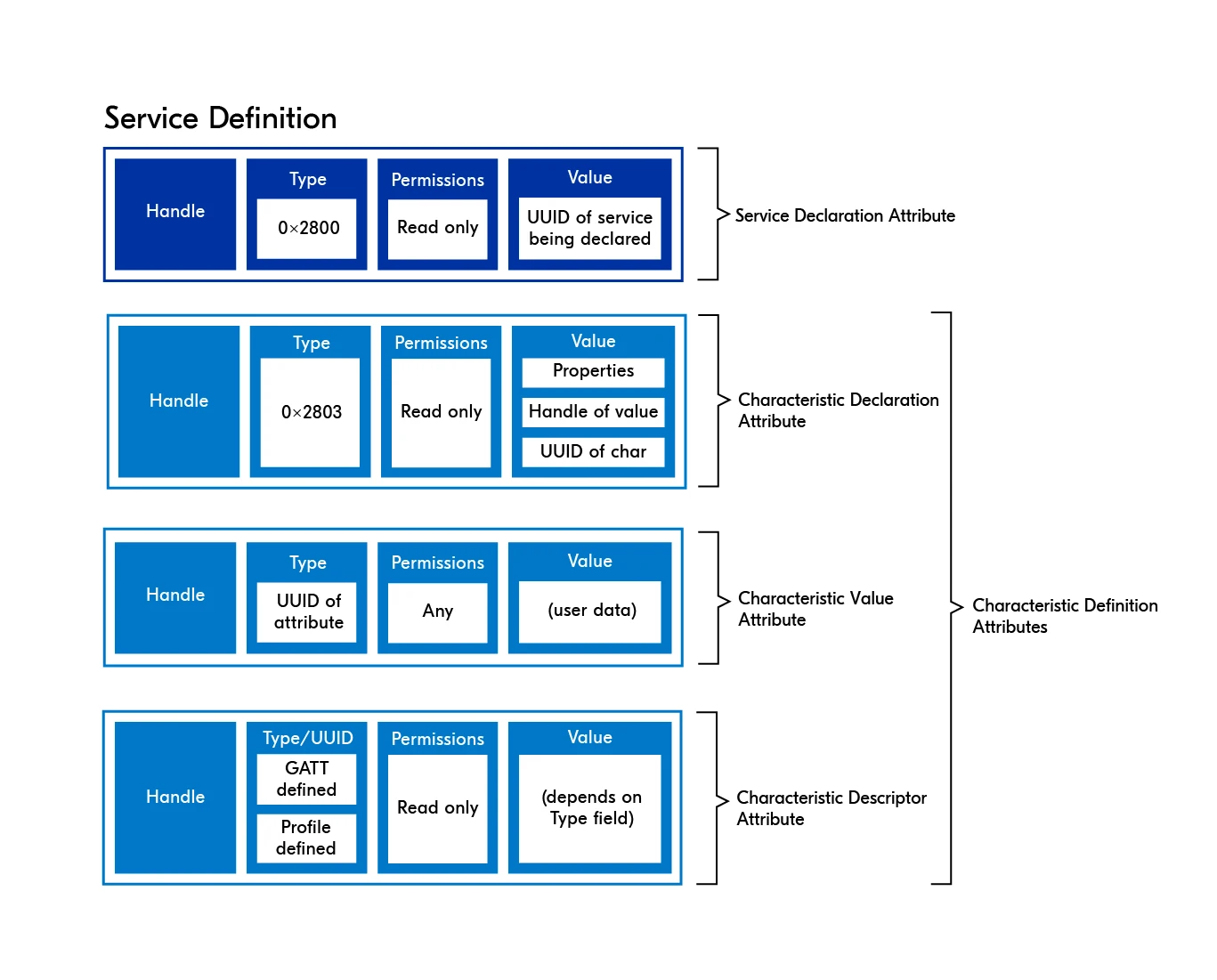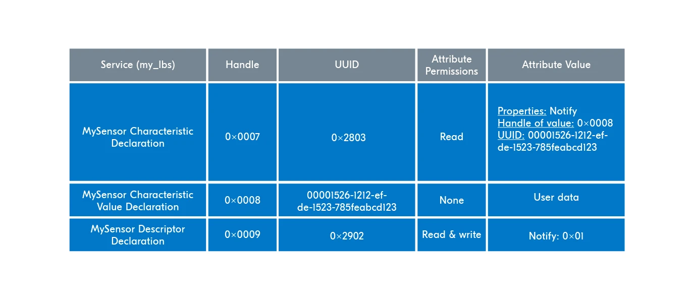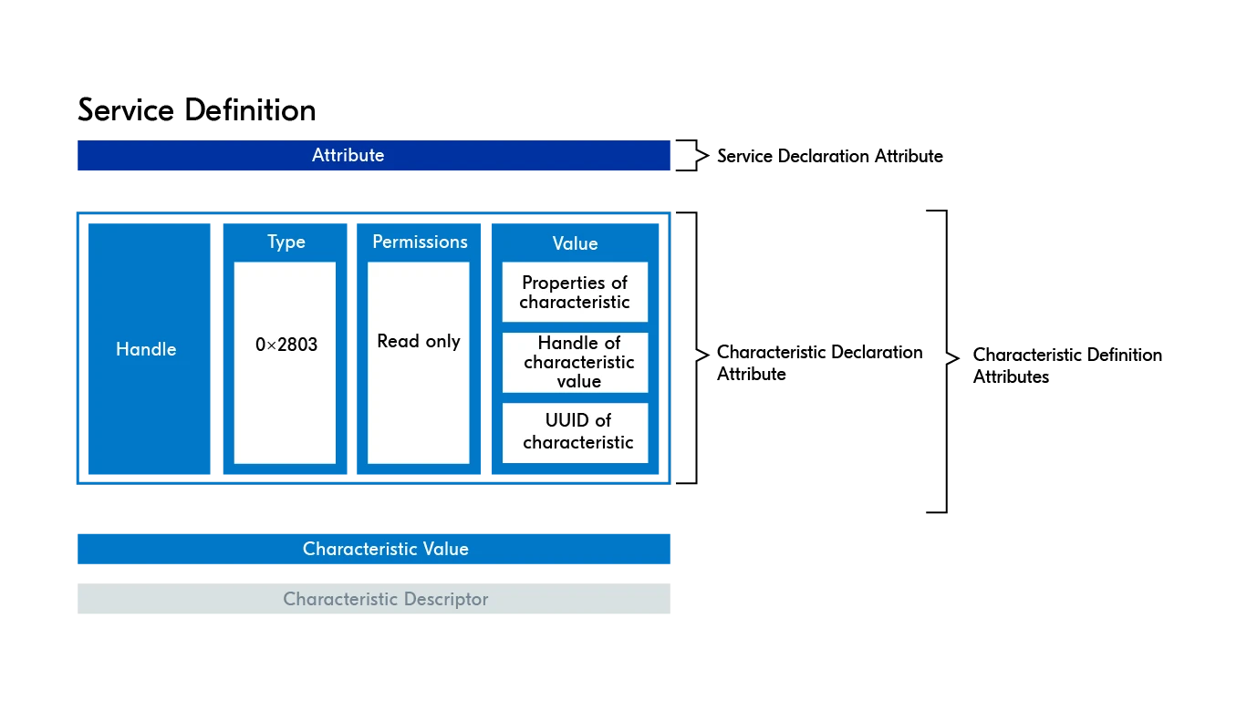 - 一个服务由多个特征组成。例如“心率服务”(Heart Rate Service)下包含“心率测量”特征、“传感器位置”特征等。
