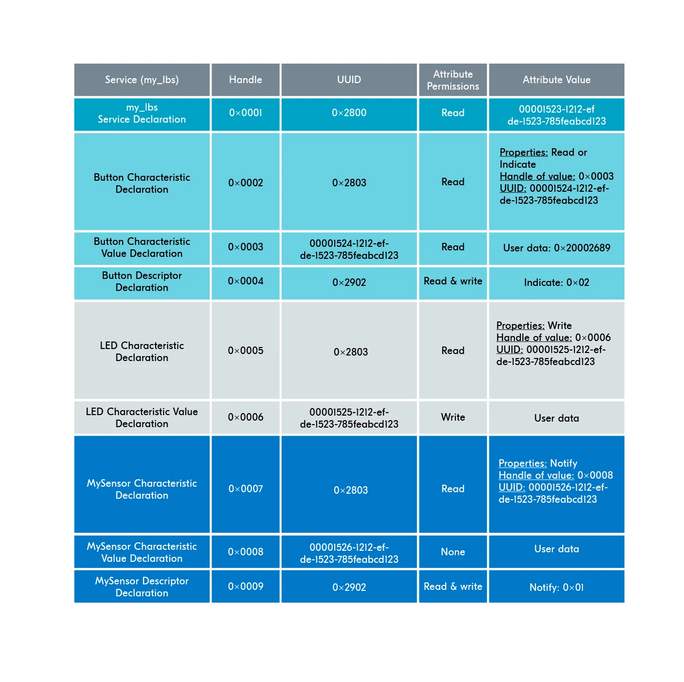 - 例如“心率测量”特征(Heart Rate Measurement Characteristic),其核心数据(心率值)和元数据(声明等)以属性形式存储,合起来就是一个特征。