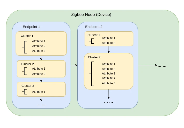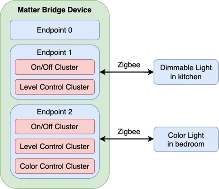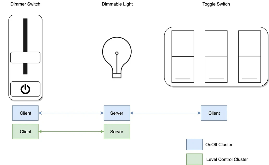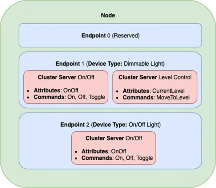集群(Clusters):集群将常用功能组合到可重用的构建基块中。在我们的图中,我们的第一盏灯(端点 1)显示了 2 个标准集群,即开/关集群和Level Control集群。开/关集群提供打开或关闭某些事物的服务。Level Control 群集提供一项服务,用于配置某些事物的级别。在我们的例子中,开/关集群帮助打开或关闭灯,Level Control集群帮助配置灯光的亮度。