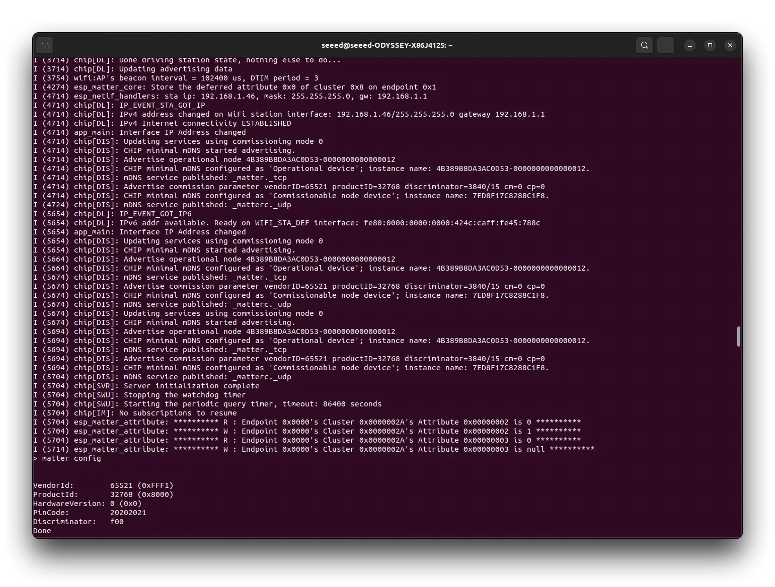 chip-tool pairing onnetwork-long ${NODE_ID_TO_ASSIGN} 20202021 3840下面的命令将根据给定的二维码(设备启动时记录的设备)发现设备,并尝试与它发现的第一个设备配对。