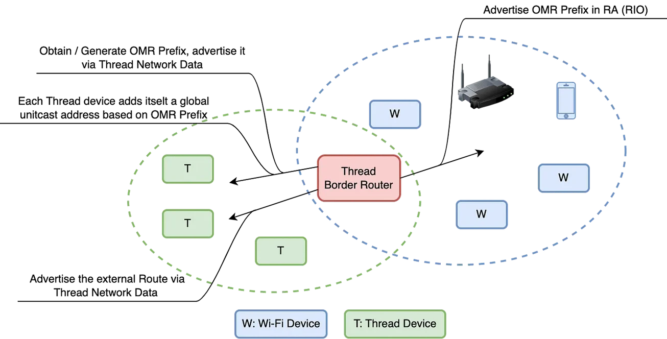 允许基于 802.15.4 的传感器直接打开基于 Wi-Fi 的灯泡,而无需应用程序或云进入画面。称为边界路由器的设备(包括 Wi-Fi 和 802.15.4 传输)有助于桥接这两个网络,从而实现从一个网络到另一个网络的直接寻址性。