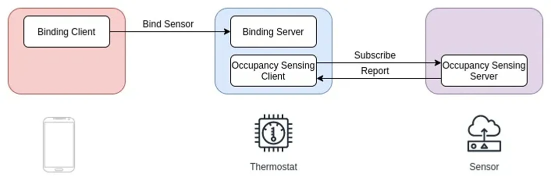 用户将恒温器绑定到occupancy sensor。完成后,恒温器可以订阅传感器属性并定期接收数据,以及在有活动(传感器属性更改)时接收数据。此方案如下图所示: