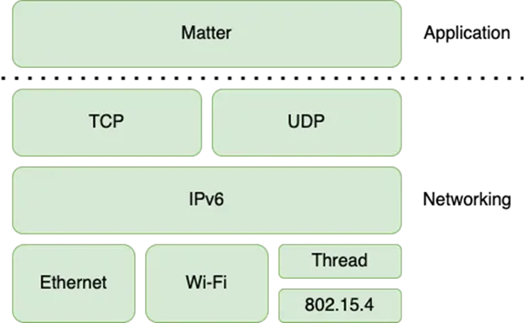 Matter 使用 Internet 协议 (IP) 定义了一个通用应用层,无论底层网络协议如何,它都能在设备之间提供互操作性。在发布时,Matter 将在以太网、Wi-Fi 和 Thread 上运行。