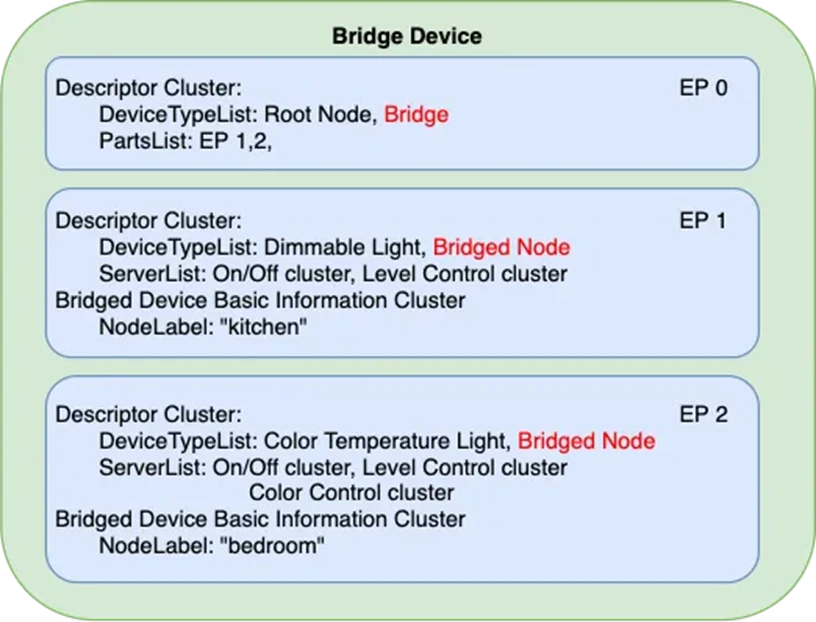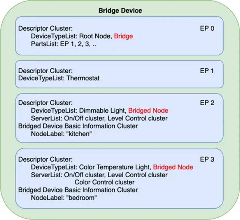 在终结点 0 上,设备类型定义为 Bridge。PartsList 字段列出了桥接设备的所有端点,每个端点代表桥接的非 Matter 端的一个设备。每个端点上的 Descriptor 集群提供有关特定桥接设备的信息。