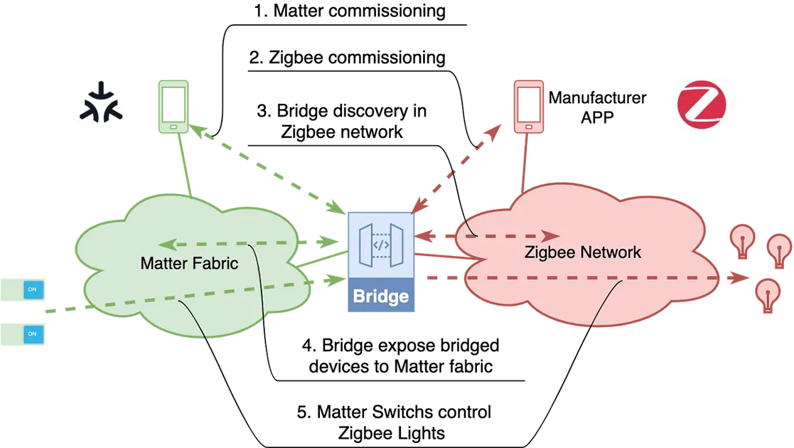Bridge 用于允许在 Matter 生态系统 (Matter Fabric) 中使用非 Matter 物联网设备。它使消费者能够继续将这些非 Matter 设备与他们的 Matter 设备一起使用。