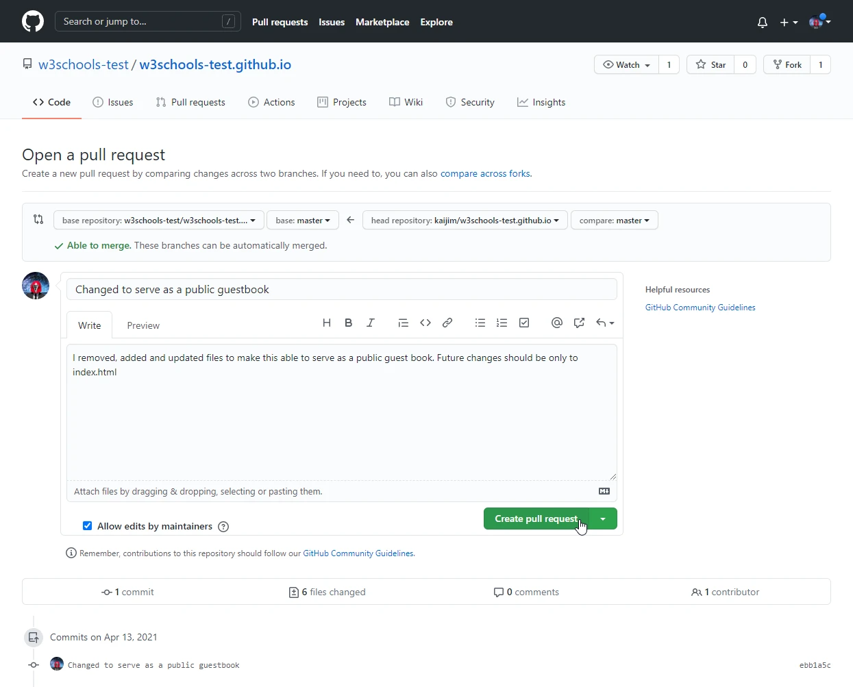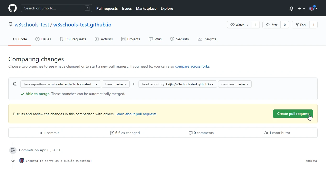 转到 GitHub,我们看到存储库有一个新的提交。我们可以向原始存储库发送一个PR:
