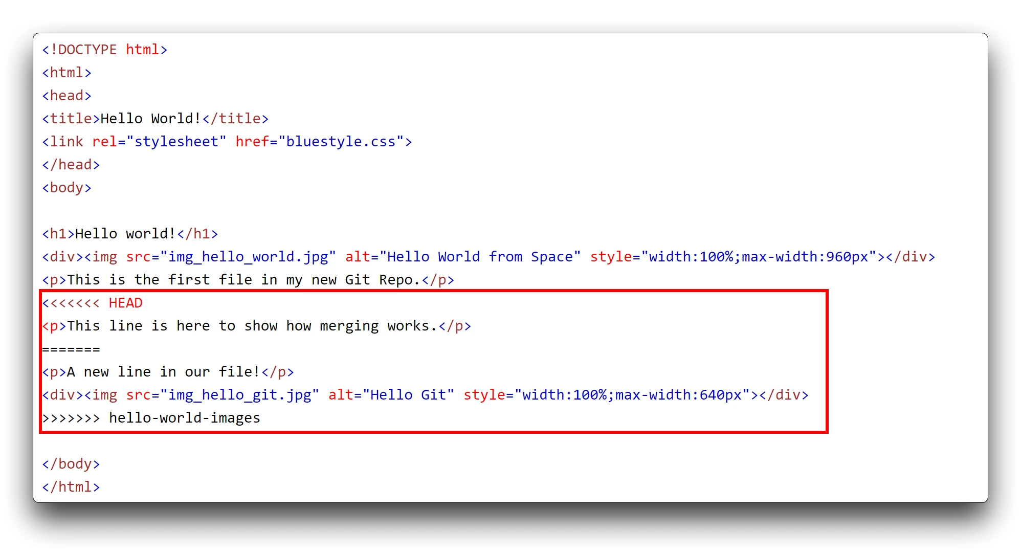 Automatic merge failed; fix conflicts and then commit the result.合并失败,因为 index.html 的版本之间存在冲突,所以我们需要解决这个冲突。