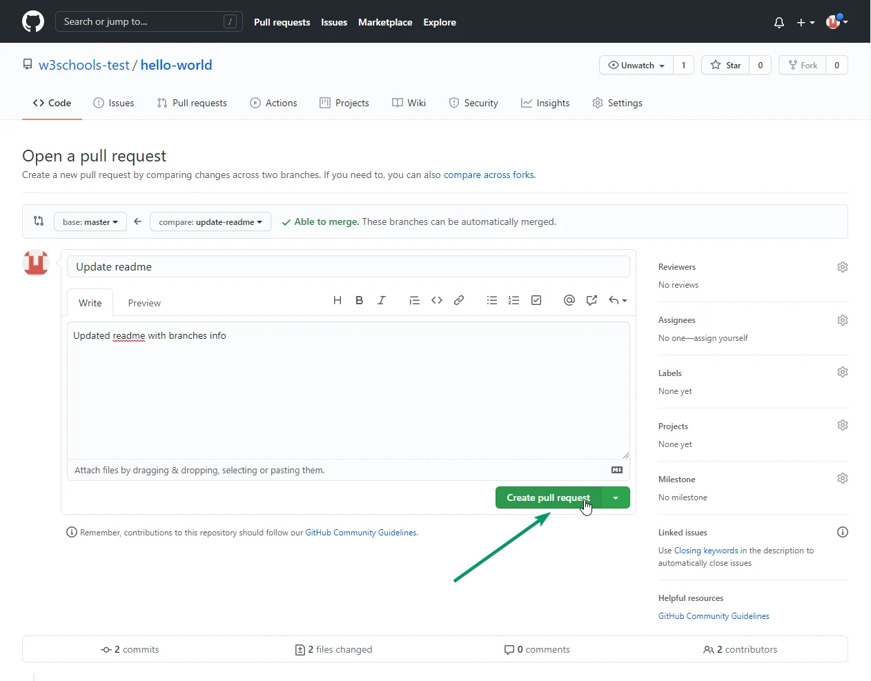 git push origin update-readme如果更改看起来不错,您可以继续前进,创建一个 pull 请求: